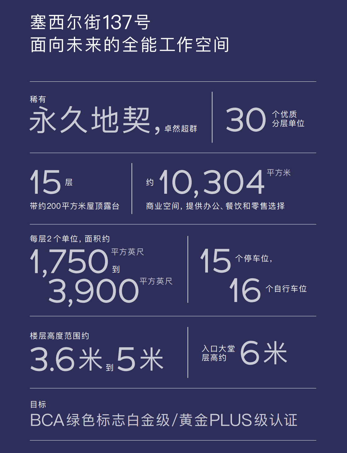 30个优质分层办公单位 彰显多功能性,每层两套单位,面积约1,750平方英尺到3,900平方英尺不等。每个单位均采用开放式平面和无柱布局,以提高效率、灵活性和协作性,并辅以俯瞰塞西尔街的全高幕墙。为满足现代企业的需求,每个分层单位 均包含两个独立卫生间和一个专属茶水间,提供额外便利。