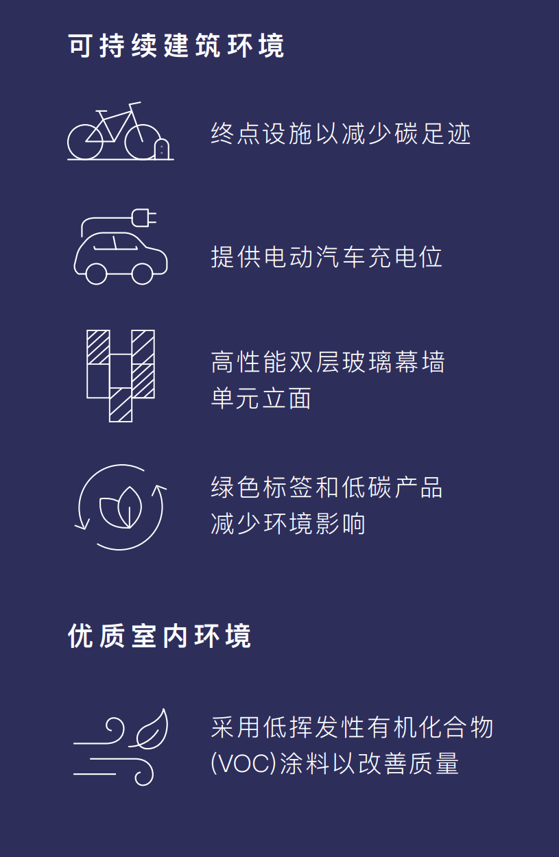 为满足绿色标准并支持注重ESG(环境、社会和治理)的企业,建筑将可持续发展和福祉放在首位,整合了节能功能,例如带再生功能的电梯、可开启窗户以实现交叉通风和改善室内空气质量,以及用于零排放通勤的自行车停车位。
